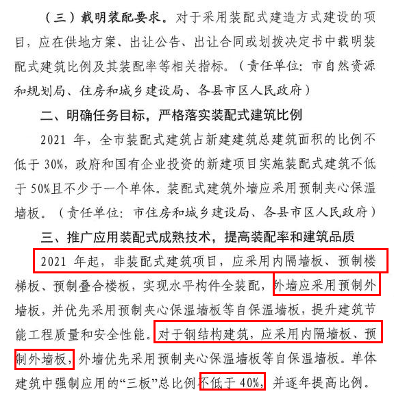 单体建筑中强制应用“三板”比例不低于40% ,并逐年提高比例。