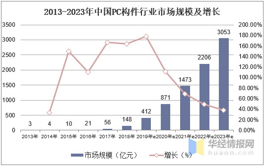 随着装配式混凝土结构建筑的快速发展,据统计,2018年中国PC构件行业市场规模达到148亿元,同比增长164.29%;2013-2018年复合增长率为120%。预计到2023年中国PC构件行业市场规模将突破3000亿元。