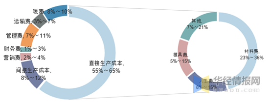 在PC构件成本中,直接生产成本占55%~65%,其中占比最.大的是材料费、人工费和模具费;间接生产成本占8%~12%,主要系各类资产折旧和费用摊销所致。