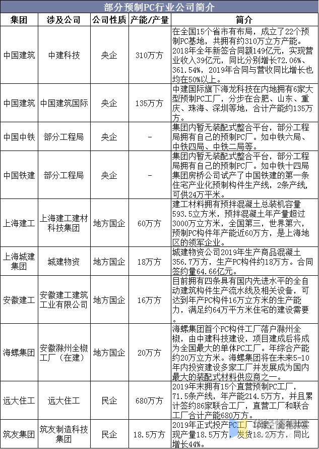 目前我国建筑央企、地方国企、民营企业均有部分龙头企业深入布局,远大住工产能居国内第.一。2019年我国拥有预制混凝土构配件生产线2483条,设计产能1.62亿m³,其中远大住工自营+联合工厂合计产能达680万方,规模居行业第.一。中国建筑旗下拥有2大平台拥有规模较大且集中的预制PC产能,包括专注于装配式建筑的平台中建科技,拥有产能约310万方,港股上市的孙公司中国建筑国际旗下的装配式建筑平台中建海龙科技,拥有产能约135万方;中国中铁和中国铁建旗下部分工程局也有预制PC工厂;上海建工拥有产能约60万方;上海城建集团旗下城建物资2019年产量约18万方;安徽建工旗下已建成约16万方产能;海螺集团2020年开工建设全国最.大单体PC工厂;筑友智造科技集团目前已投产10家工厂,产量约19万方。