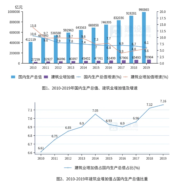 建筑业增加值增速与国内生产总值增速偏差收窄,建筑产业地位稳固。据国家统计局数据显示,2019年全国国内生产总值为990,865亿元,按可比价格计算,比上年增长6.1%,增速下降了0.6个百分点,实现了年初6%-6.5%的预期发展目标。2019全年全社会建筑业实现增加值为70,904亿元,比上年增长5.6%,增速上升了0.8个百分点。建筑业增加值增速低于国内生产总值增速0.5个百分点。2019年,建筑业增加值占国内生产总值的7.16%,较上年上升了0.04个百分点,达到了近十年最.高点。建筑业作为国民经济支柱产业之一,地位依旧稳固。