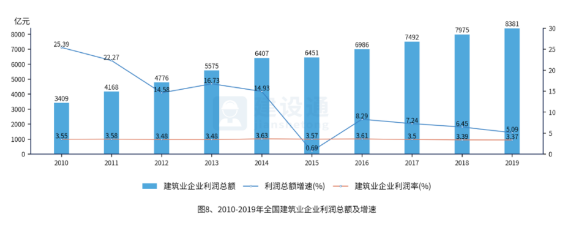 企业利润总量继续保持增长,行业产值利润率略有下降。2019年,全国具有资质等级的总承包和专业承包建筑业企业实现利润8,381亿元,比上年增加406亿元,增速为5.09%,增速比上年下降1.36个百分点。自2009年以来,建筑业产值利润率(利润总额与总产值之比)一直在3.5%上下徘徊。2019年,建筑业产值利润率为3.37%,比上年降低了0.02个百分点。