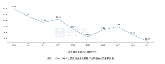 本年新签合同额占签订合同总额比例为53.07%,比上年下降了2.12个百分点,连续两年出现下降。