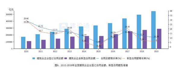 建筑业企业签订合同总额、新签合同额持续增长,但增速均有放缓。2019年,全国建筑业企业签订合同总额为545,038.89亿元,比上年增长10.24%,增速与上年同比下降2.26个百分点。其中,本年新签合同额289,234.99亿元,比上年增长6%,增速与上年同比下降1.16个百分点。