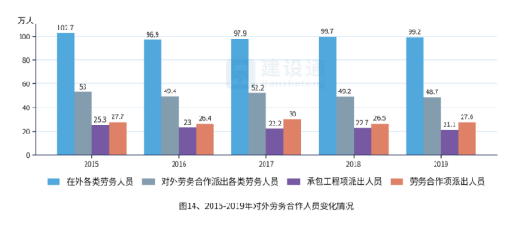 在外各类劳务人员、对外劳务合作派出各类劳务人员、承包工程项派出人员均在减少。2019年,我国对外劳务合作派出各类劳务人员48.7万人,较上年同期减少0.5万人;其中承包工程项下派出21.1万人,劳务合作项下派出27.6万人。12月末在外各类劳务人员99.2万人,较上年同期减少0.5万人。