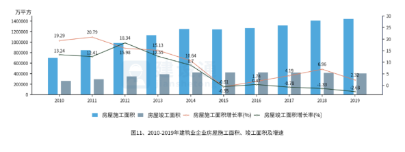 房屋施工面积增长,竣工面积连续三年出现下降,全国房屋竣工面积中,住宅占比最重,接近七成。2019年,全国建筑业企业房屋施工面积达144.16亿m2 ,增速为2.32%,比上年减少了4.64个百分点。2019年,全国建筑业企业房屋竣工面积40.24亿m2,较上年下降2.68%,连续三年出现负增长。