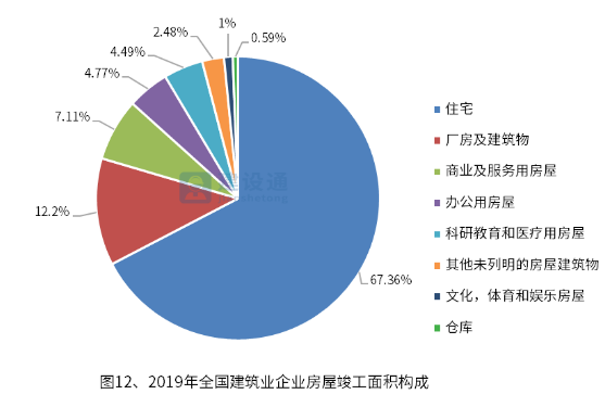 从全国建筑业企业房屋竣工面积构成情况看,住宅竣工面积依然占据大头,占比为67.36%;厂房及建筑物竣工面积占12.2%;商业及服务用房屋竣工面积占7.11%;办公用房屋竣工面积占4.77%;剩下的8.56%为其他种类房屋竣工面积。其中,科研、教育和医疗用房屋竣工面积占4.49%;文化、体育和娱乐房屋竣工面积占1%;仓库竣工面积占0.59%,剩下的其他未列明的房屋建筑物竣工面积占2.48%。
