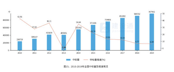 全国施工企业中标量持续增长。2019年,全国中标量967,902个,比上年增加了58,120个,增速为6.39%,比上年下降了0.38个百分点。中标量增速较上一年有轻微下降。