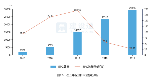 EPC项目中标数量缓慢增长,增速持续放缓。2019年,全国EPC项目中标数量29,356个,比上年增加了6,038个,增速为25.89%,比上年下降了30.01个百分点。