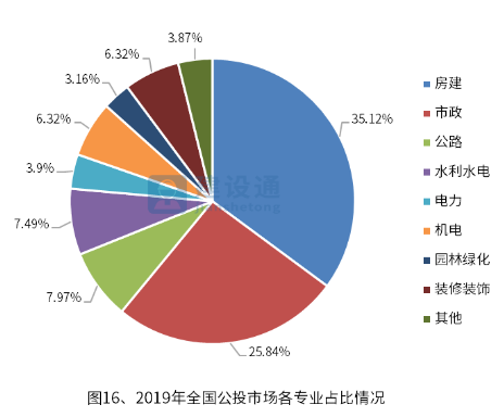 房建、市政项目招标量接近六成。2019年,各专业平均招标数量为84,166个。房建项目招标数量最多,占招标总量的35.12%。市政项目紧随其后,占招标总量的25.84%。其他专业项目招标量占比均不足10%,其中电力、园林绿化以及其他专业占比均不足4%。