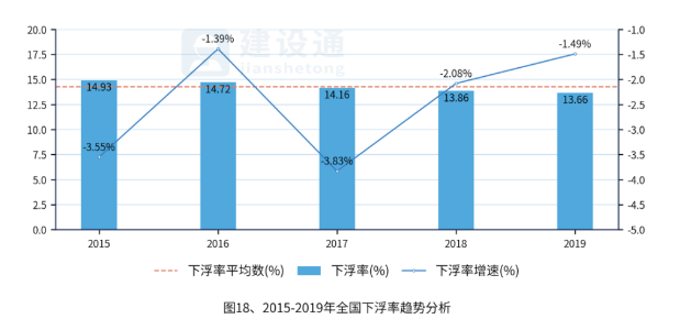 近五年全国下浮率持续下滑。2015年至2019年,平均下浮率为14.26%。2019年,全国下浮率为13.66%,比上年降低了1.49%,降幅为0.59%。