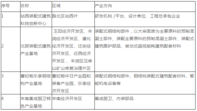 3、产业规划按照《唐山市装配式产业发展规划(2019-2025)》的总体规划和布局,规划到 2025 年形成唐山市装配式建筑产业“一中心三基地”的产业布局体系,一中心即站西装配式建筑科技创新中心,三基地即北部装配式建筑产业基地(玉田、丰润、遵化、迁西、迁安)、曹妃甸乐亭钢结构产业基地、丰南集成厨卫特色产业基地。