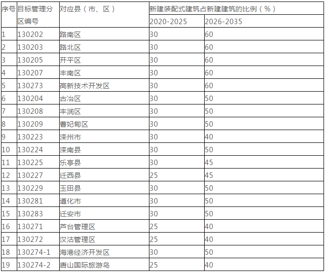 1、总体指标规划到2025年,唐山市装配式建筑占新建建筑面积比例达到30%,中心城区装配式建筑占新建建筑面积比例达到30%;展望到2035年唐山市装配式建筑占新建建筑面积比例达到50%,中心城区装配式建筑占新建建筑面积比例达到60%。逐步建立起完善的政府引导、市场主导的建筑工业化运作体系,不断完善建筑工业化的政策管理机制、激励机制、财政扶持机制和监督考核制度,并具备良好的实施效果。
