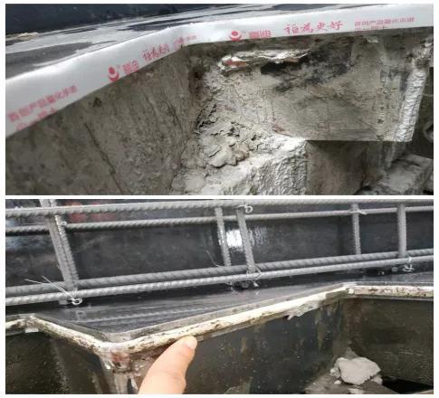 (4)拆模过早,因因混凝土强度等级不足而造成混凝土边角随模具拆除破损: