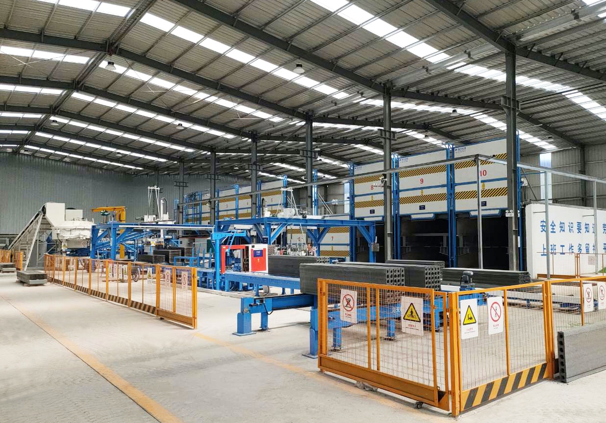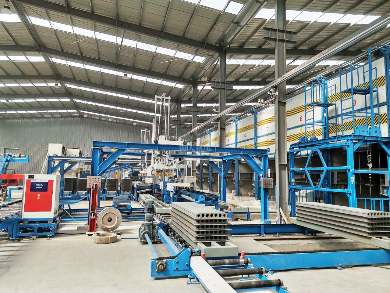 主要设备组成:包括物料输送返回系统、主机成型系统、中央控制系统、模板输送系统、墙板码垛系统、墙板切割系统、成品翻转打包系统、模板定位系统、蒸养系统等。