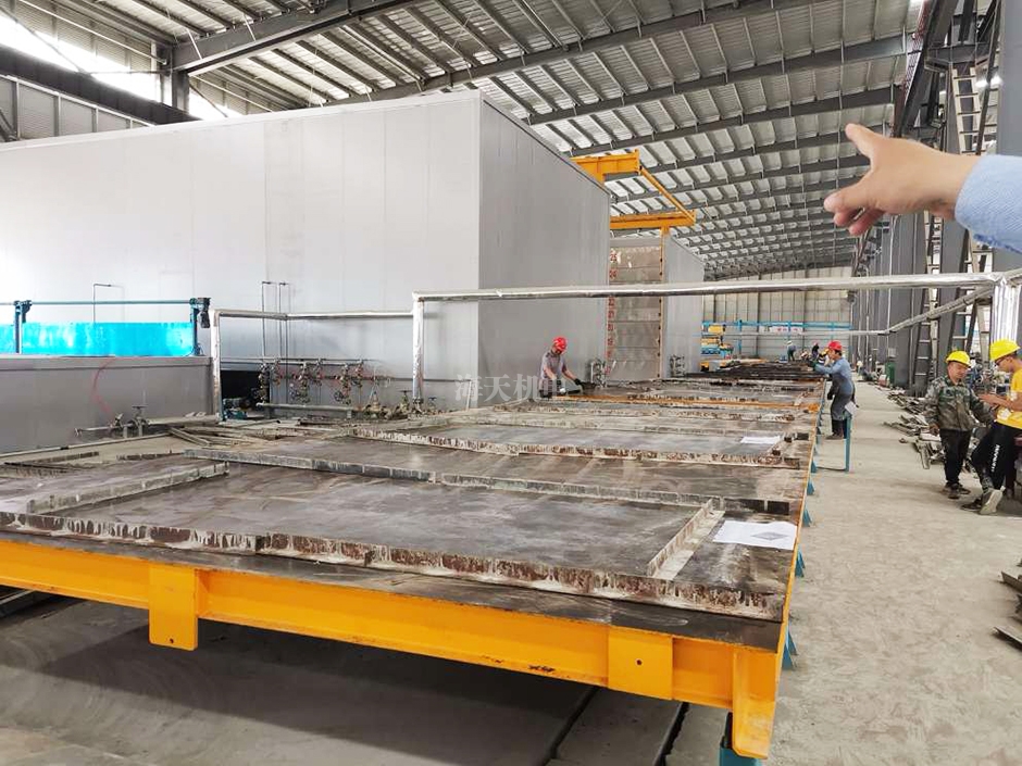 该生产线系统组成:中央控制系统、布料系统、模台循环系统、模台预处理系统、养护系统、脱模系统等。