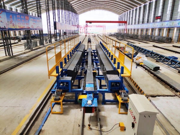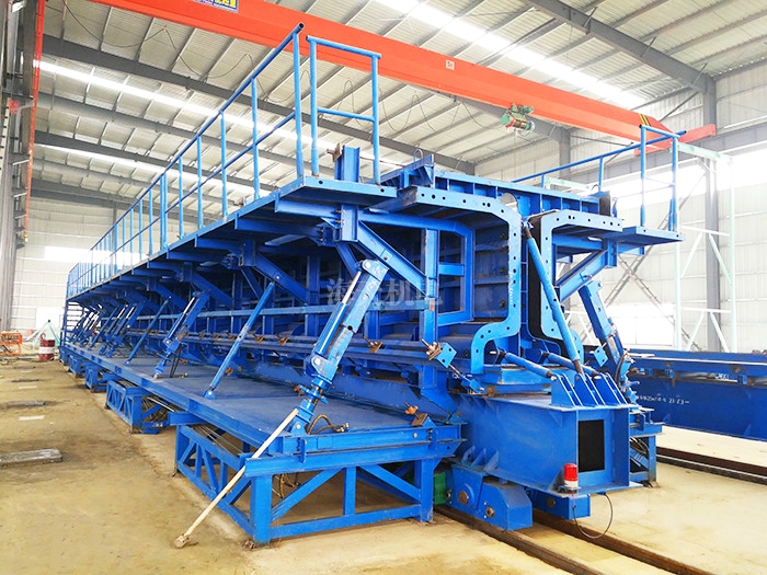 3、侧模采用槽钢横肋、面板、工字钢支撑组合而成,分节加工,侧模采用台位固定式结构(端模包侧模),分节根据跨度及横隔板位置区分。